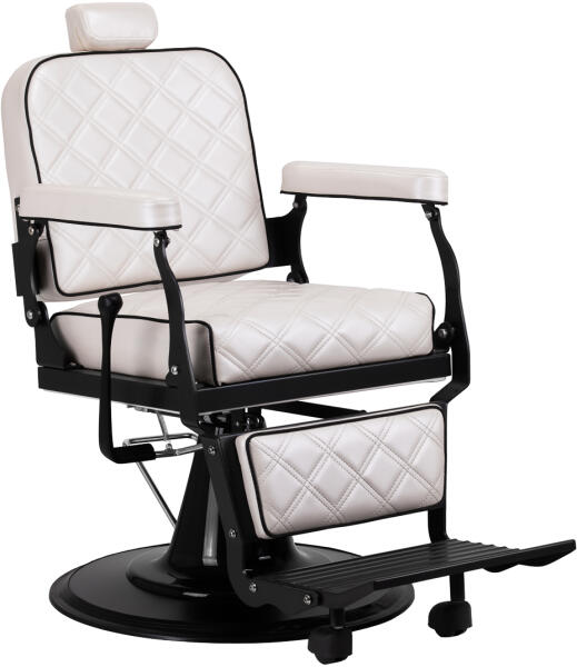 A masszív talp biztosítja a stabilitást és a nagyfokú használati kényelmet. A deformációálló habszivacsból készült üléstöltés és a kellemes tapintású, gyöngyházfényű műbőrből készült kárpitozás hosszú időre biztosítja a tartósságot és a kényelmes használatot. Ezek az anyagok nedvességállóak, tartósak és könnyen tisztíthatók. A kárpit krémszínű árnyalata egyedi jelleget kölcsönöz a karosszéknek, elegáns stílusa pedig tökéletesen illeszkedik a fodrászüzlet berendezéséhez.